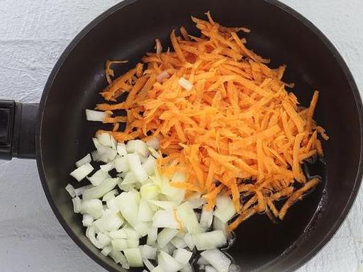 Другу половину цибулі наріжте кубиками. Очистіть та промийте моркву. Натріть на великій тертці. На сковороді розігрійте олію та викладіть цибулю та моркву. Обсмажуйте на невеликому вогні 4-5 хвилин, помішуючи.