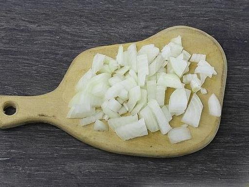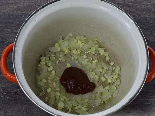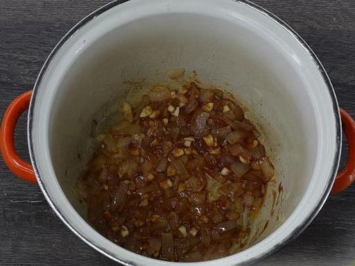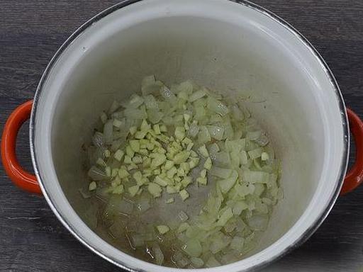 Очистіть часник і дрібно наріжте. Додайте до цибулі. Смажте близько 1 хвилини на невеликому вогні.