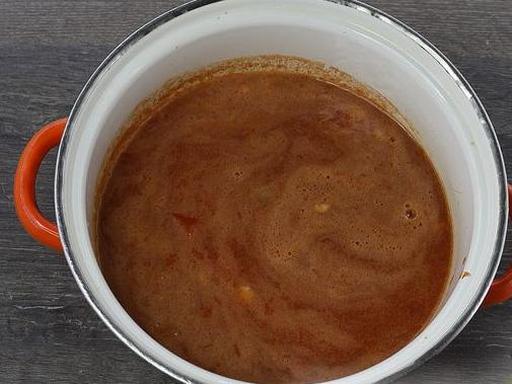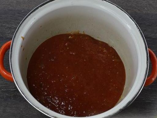 Влийте подрібнені томати в каструлю. Добре перемішайте і доведіть до кипіння.