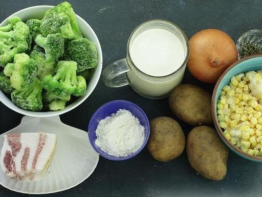 Підготуйте всі інгредієнти. Я використовувала заморожені броколі та кукурудзу, але можна взяти свіжу броколі та консервовану кукурудзу.