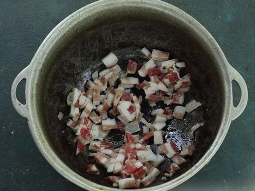 Наріжте бекон тонкими невеликими шматочками. Розігрійте каструлю або казан та обсмажте бекон на помірному вогні протягом 7-8 хвилин до золотистої скоринки з усіх боків. Викладіть обсмажений бекон на паперову серветку для видалення зайвого жиру.