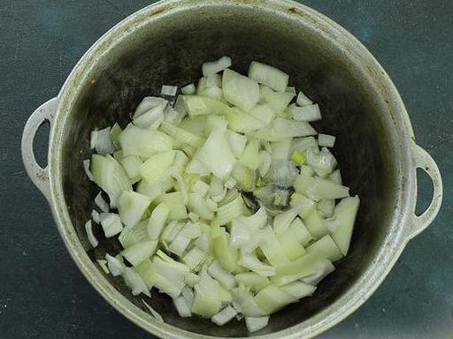 Очистіть цибулю та наріжте кубиками. Викладіть цибулю в казан з жиром, що витопився з бекону, та обсмажте 5-7 хвилин до легкої золотистості.