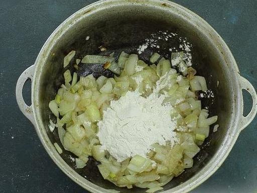 Всипте борошно, перемішайте. Обсмажуйте 30-40 секунд на маленькому вогні.