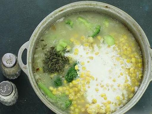 Додайте броколі та кукурудзу. Влийте вершки. Всипте сіль, чорний мелений перець та чебрець. Перемішайте. Варіть з моменту закипання 8-10 хвилин, до готовності всіх інгредієнтів.