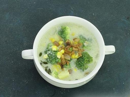 Цей вершковий суп з броколі, беконом та кукурудзою виходить неймовірно смачним та ситним. Він обов'язково сподобається всім поціновувачам перших страв з вершками. Шматочки рум'яного бекону додають готовій страві неповторну нотку. Спробуйте приготувати та поділіться своїми враженнями.